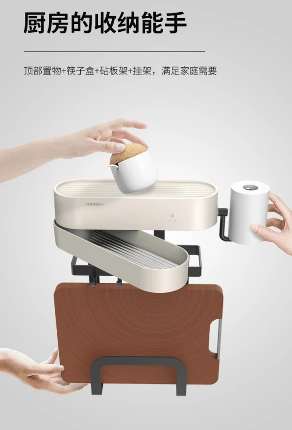 Ionic hot air blows and sterilizes cutting boards, dishcloths, spatulas and other supplies.